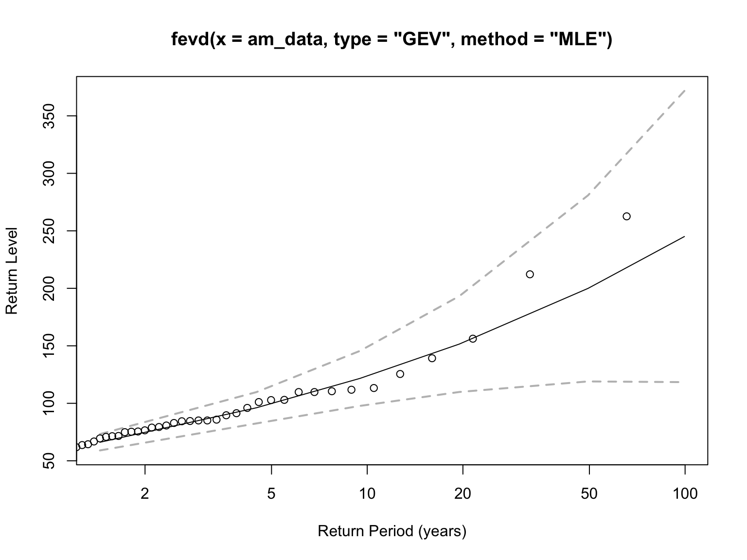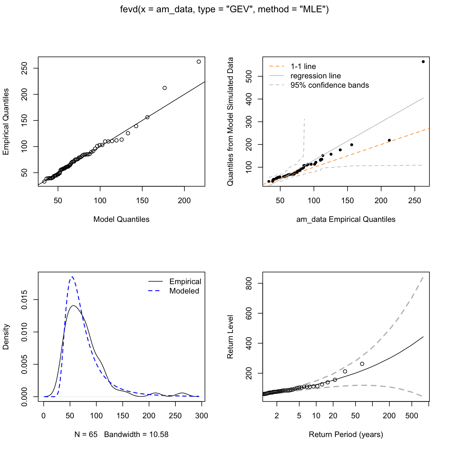 The diagnostic plots (Figure 10) indicate a reasonable fit of the GEV model. The Q-Q plots (top row) show good alignment between empirical and model quantiles, with some expected deviation for the highest values. The density plot (bottom left) shows the fitted GEV density capturing the empirical distribution shape well. The return level plot (bottom right) confirms that most observed annual maxima fall within the model’s confidence intervals.