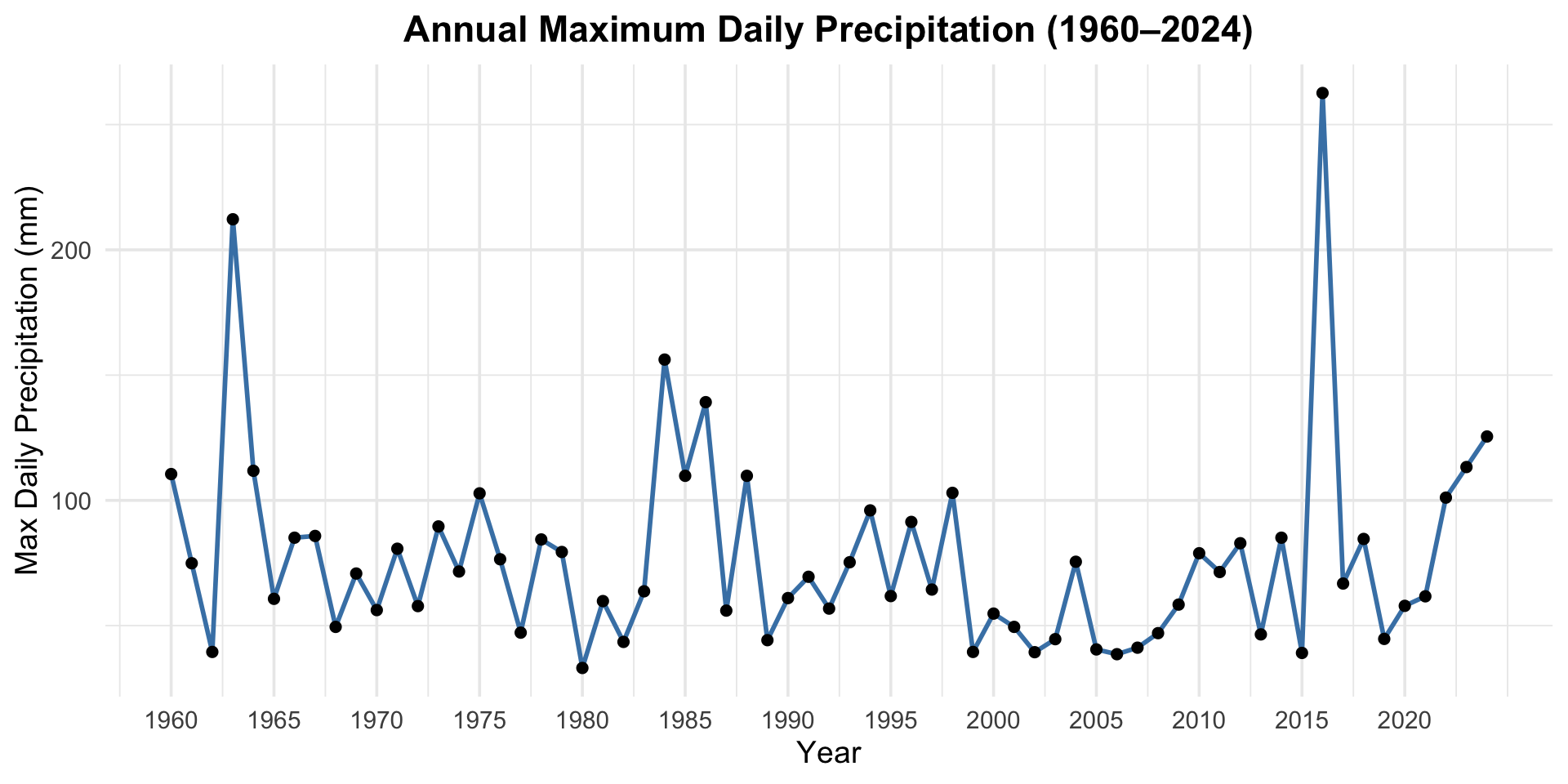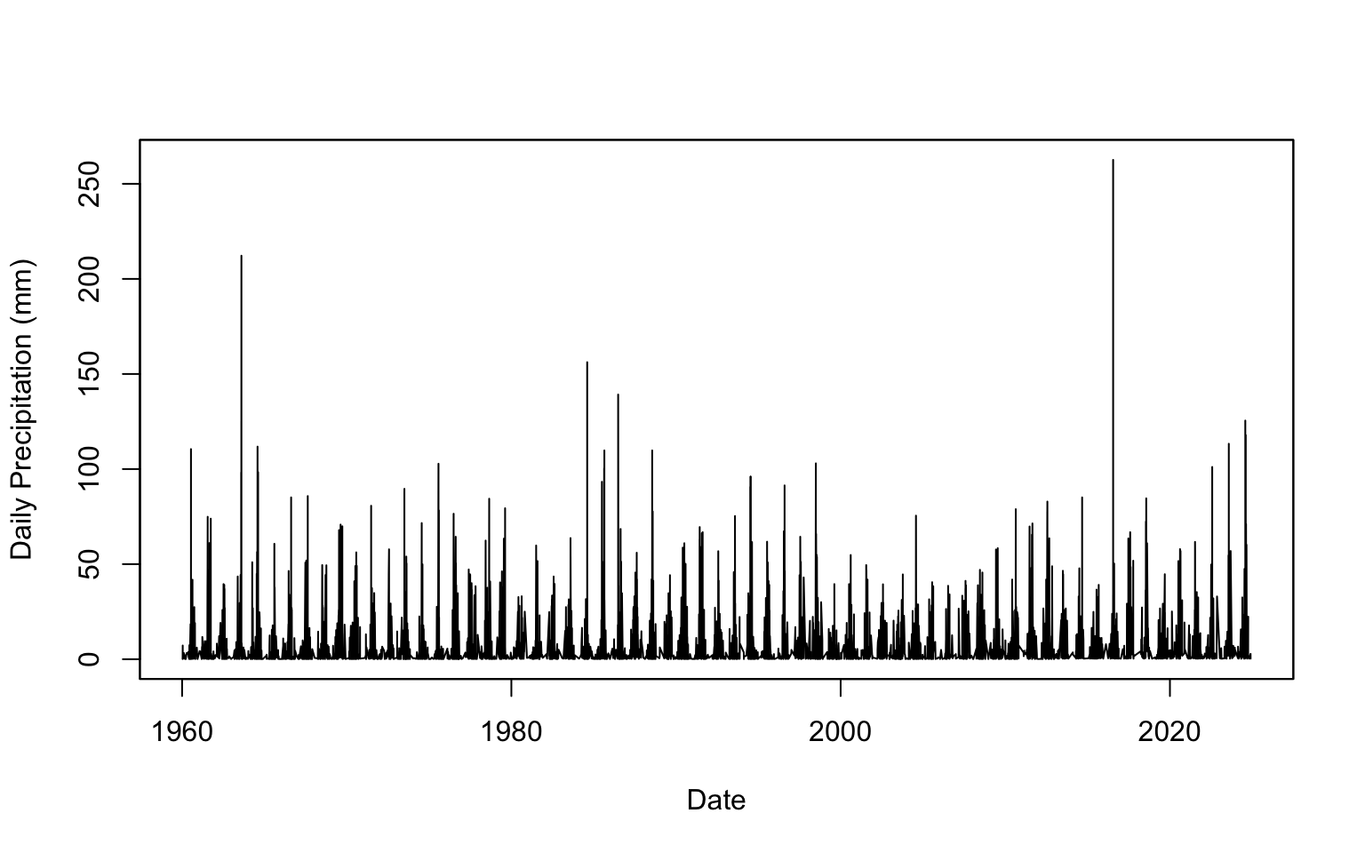 A time series plot (Figure 2) offers a closer look at the variability across the 65-year period. Years such as 1963, 1984, 2016, and especially 2023 stand out with unusually high daily rainfall. However, these extreme spikes occur irregularly and without a clear trend. This unpredictability is precisely what motivates the use of EVT—to help assess the probability and impact of rare but severe rainfall events that could drive urban flooding and infrastructure stress.