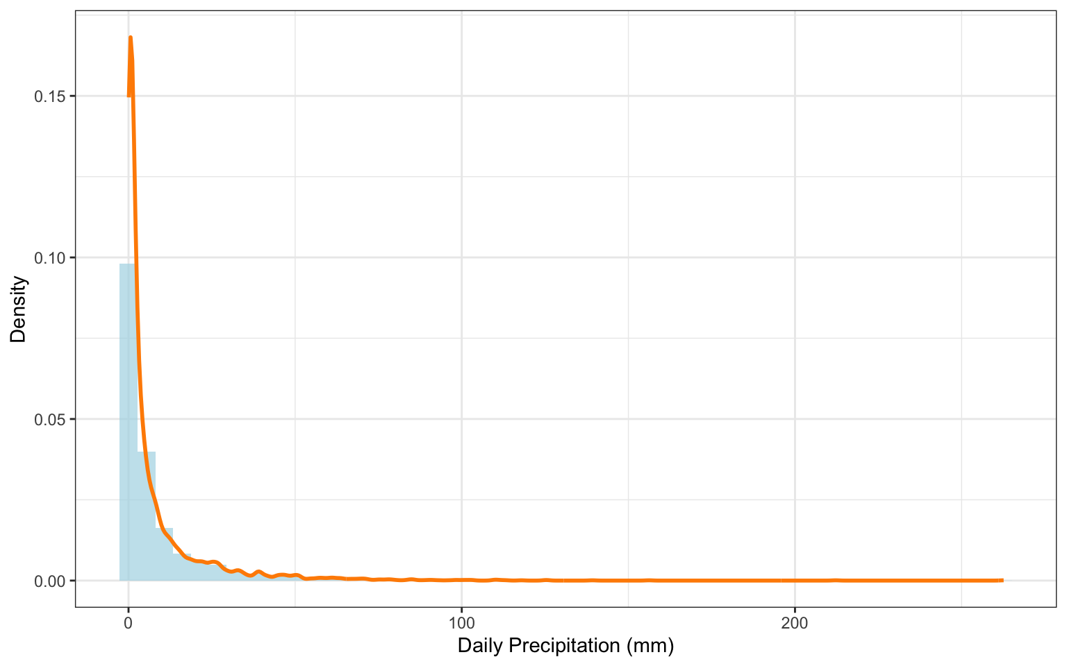 For the purpose of extreme value analysis, only non-zero precipitation days were retained. This focuses the modeling on actual rainfall events and avoids distortion from dry days. The initial statistical summary (Table 1) reveals a mean of 8.05 mm for rainy days, with a maximum observed value of 262.60 mm. The distribution is highly right-skewed (Figure 1), which is typical for precipitation data—most days see light rainfall, but a few outliers reach very large values. This skewness highlights the relevance of Extreme Value Theory (EVT), which is specifically designed to analyze the tails of such distributions.