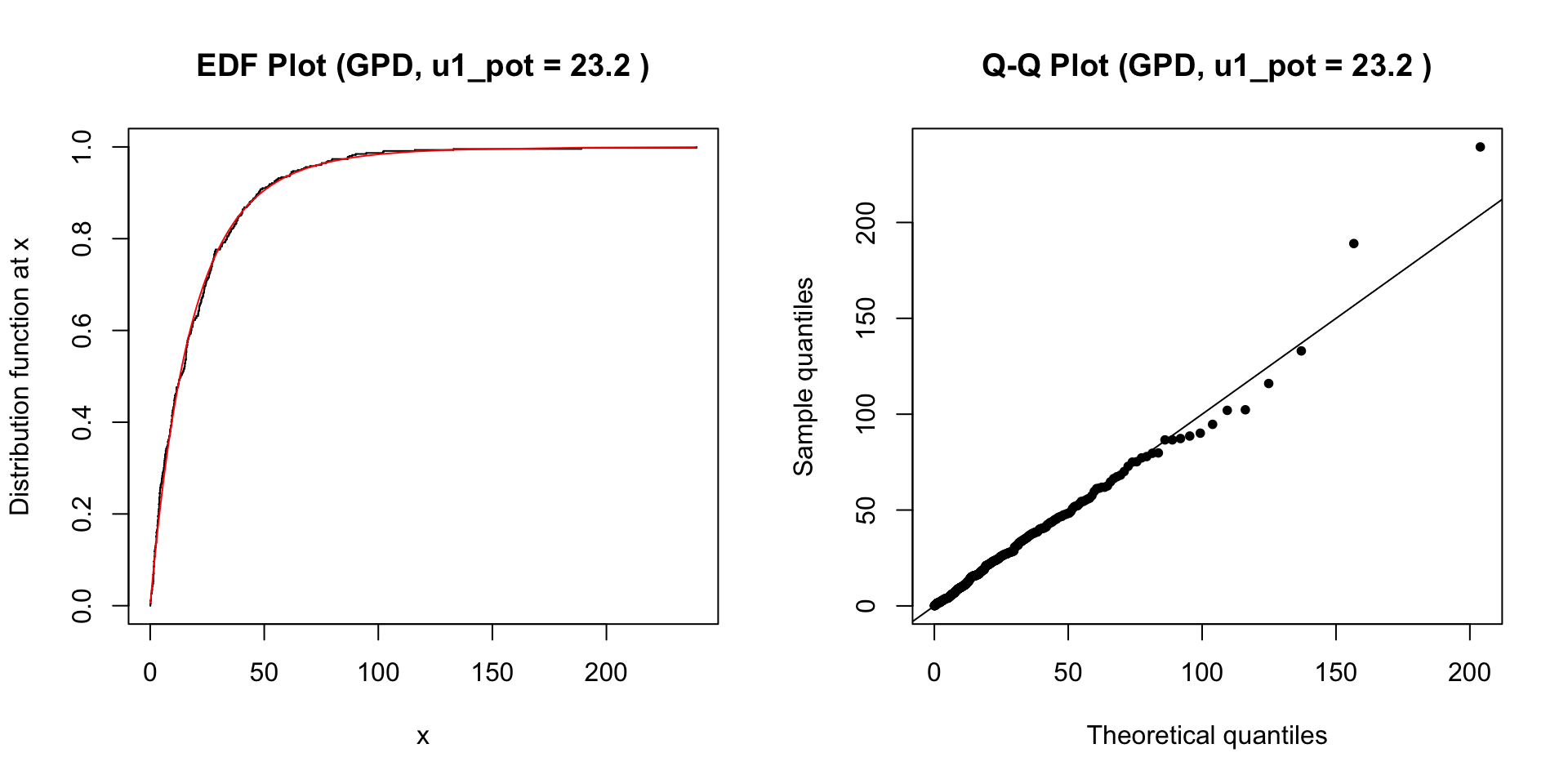 The diagnostic plots (Figure 4) suggest the GPD model reasonably captures the distribution of precipitation excesses. The EDF plot (left) shows good agreement between the empirical and fitted cumulative distributions. The Q-Q plot (right) shows points generally falling along the diagonal, indicating a good fit, although slight deviations in the upper tail suggest potential underestimation of the most extreme risks.