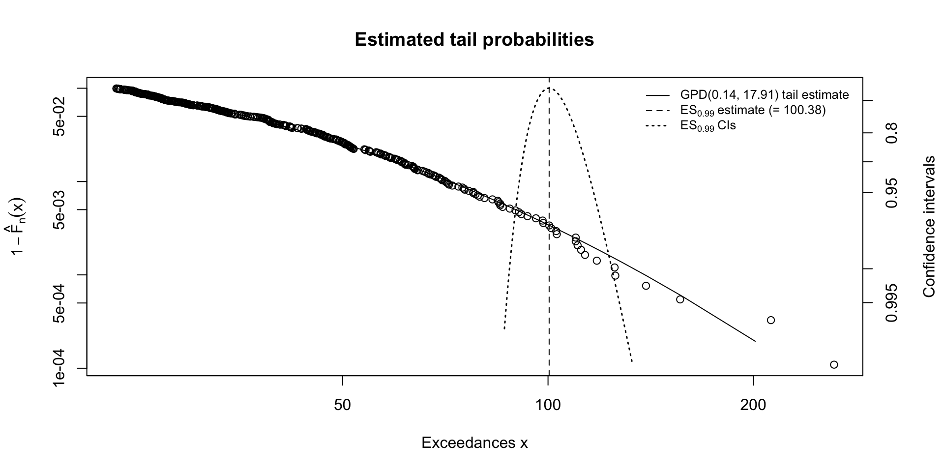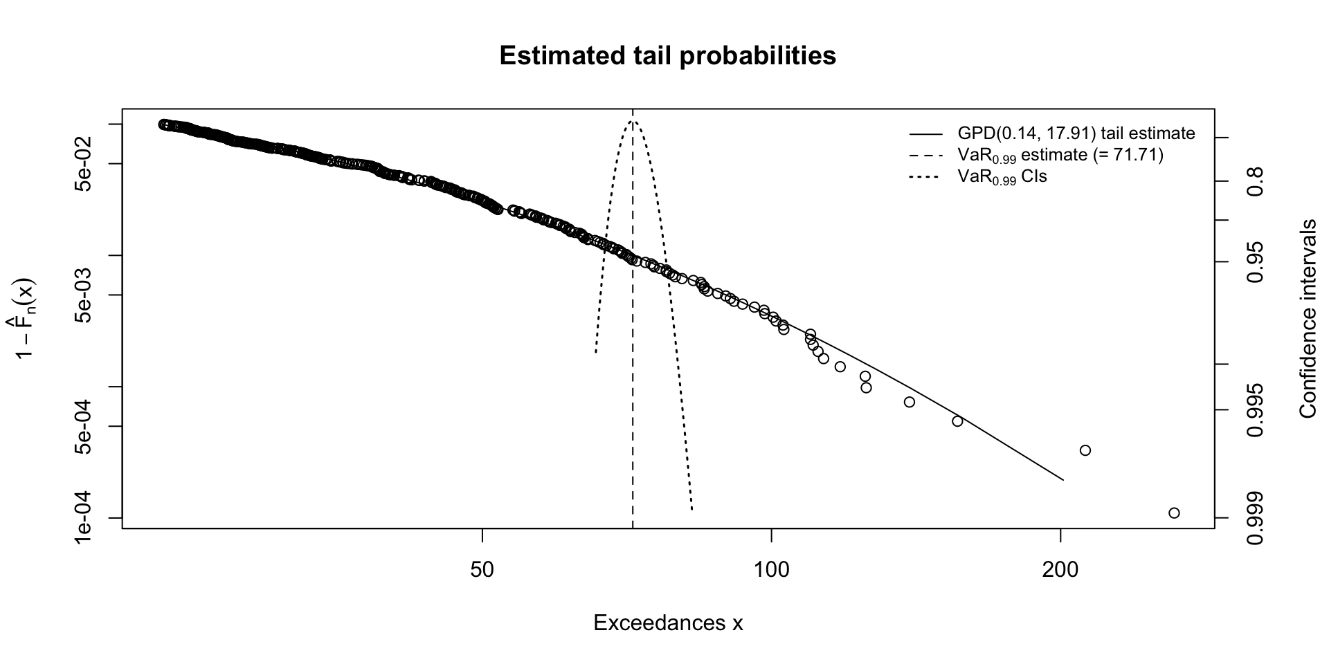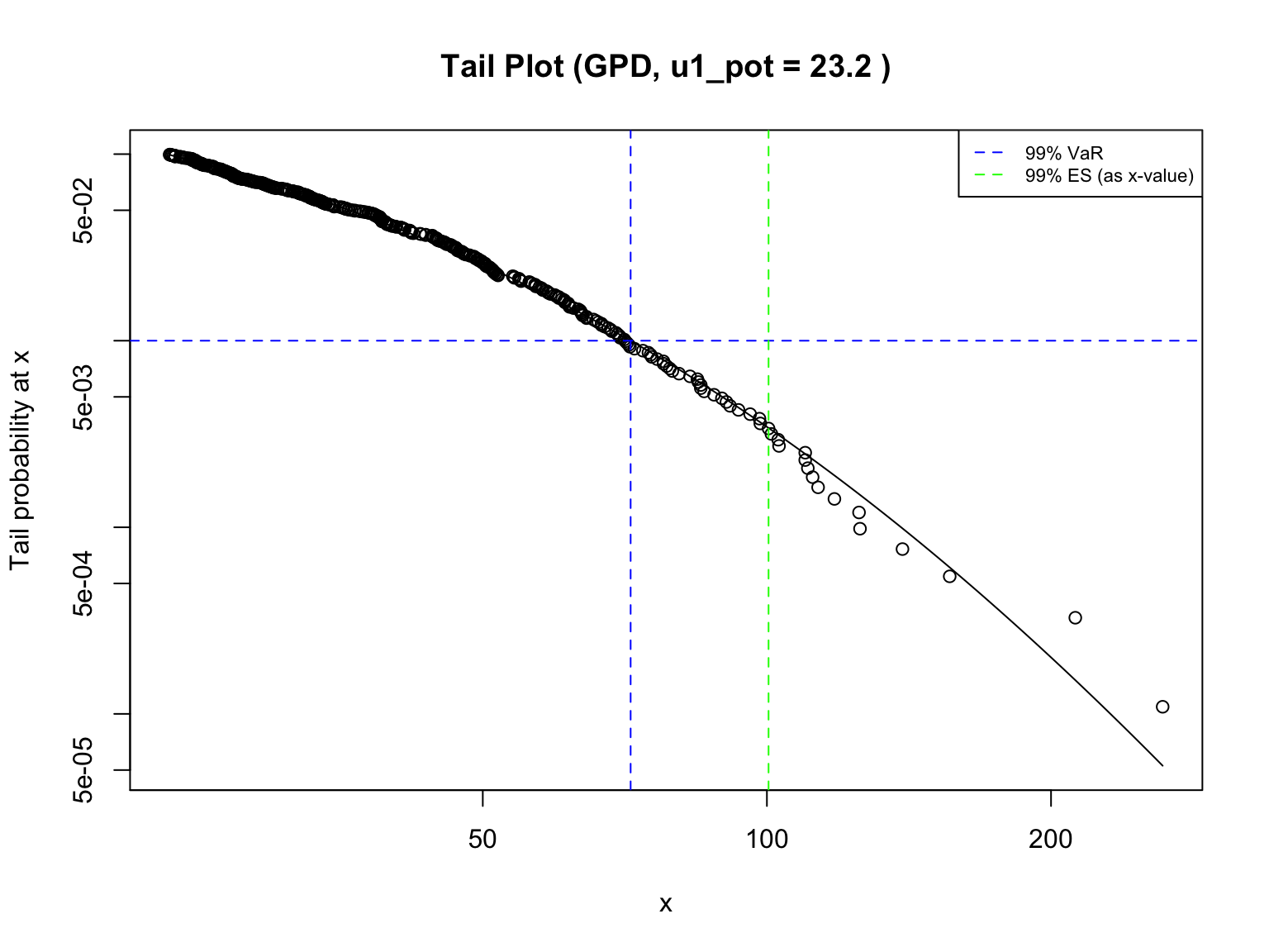The tail probability plots illustrate the fitted GPD tail along with confidence intervals for the 99% VaR (Figure 5) and ES (Figure 6) estimates, quantifying the uncertainty around these risk measures. These figures demonstrate that the model generally aligns well with the observed data in the upper tail, though the widening confidence bands near the extremes indicate increased uncertainty as values become rarer. The tail_plot (Figure 7) provides an alternative visualization of the tail fit relative to the empirical data. These plots highlight both the rarity and potential severity of extreme rainfall events and emphasize the usefulness of GPD-based risk measures for understanding and preparing for high-impact climate extremes.