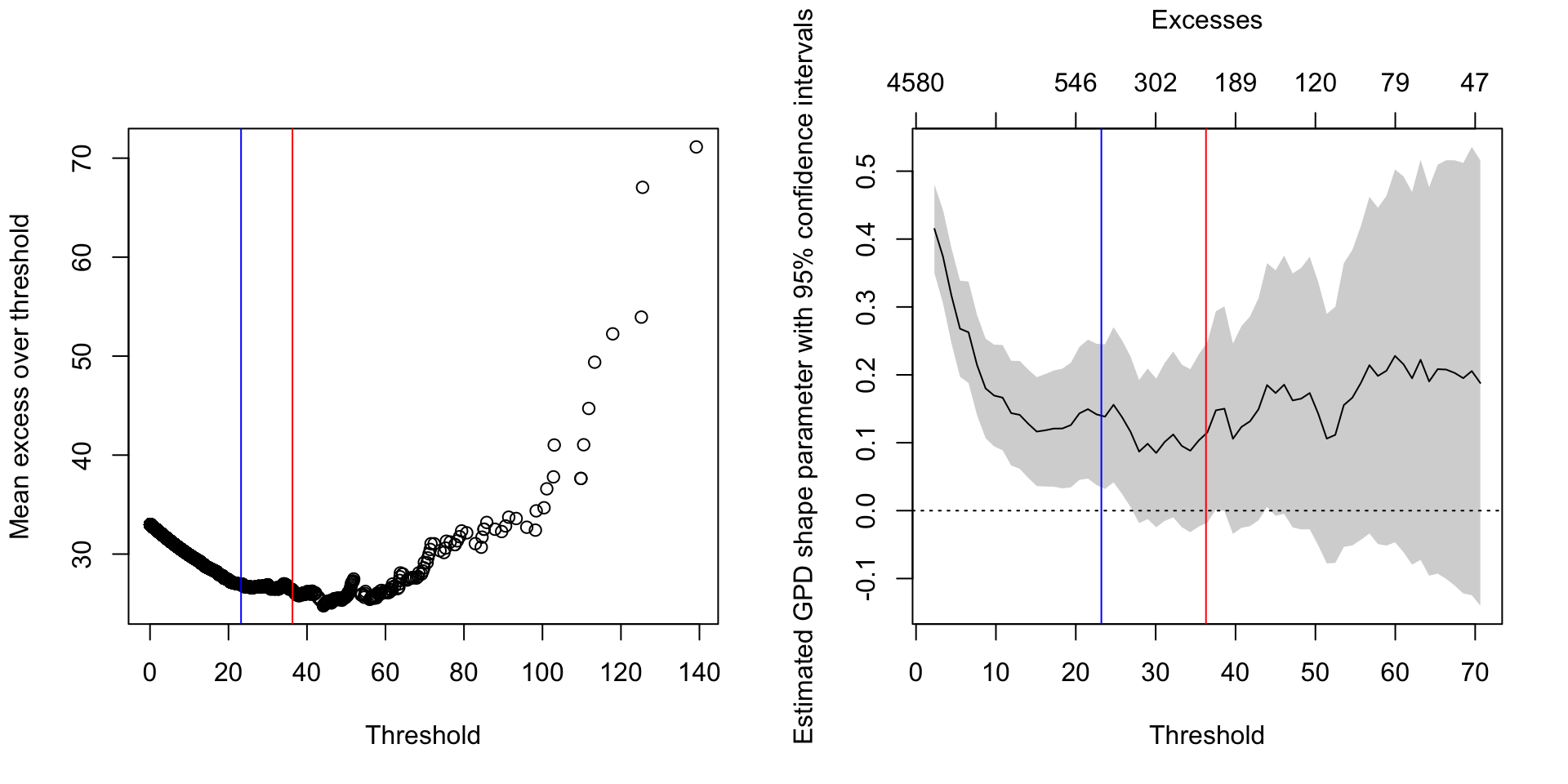 Under the POT framework, for a chosen threshold u, the exceedances \(y = x - u\) are modeled using the GPD: