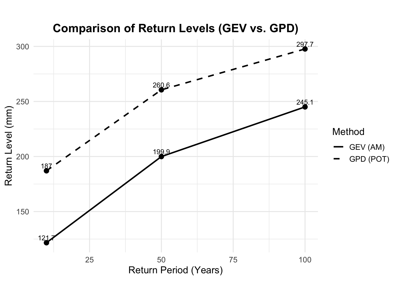 Figure 12 provides a comparison of return level estimates from the AM-GEV and POT-GPD models across different return periods. For the 10-year event, the GEV method yields an estimate of approximately 121.7 mm, while the POT method estimates about 187.0 mm. For the 50-year return period, the GEV estimate is 199.9 mm versus 260.6 mm from the POT model. Most notably, the estimated 100-year return level is approximately 245.0 mm under the GEV model, compared to about 297.7 mm under the POT-GPD approach. This reveals a consistent pattern where the POT method produces higher return level estimates at all return periods.